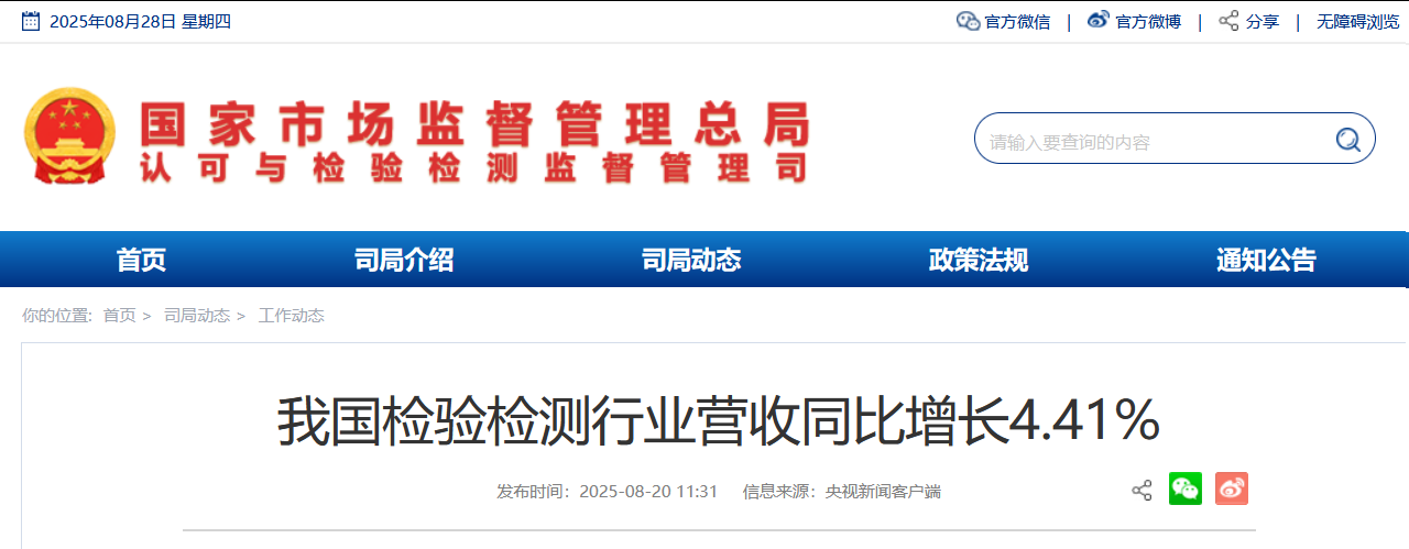 • 2025-08-28 我國(guó)檢驗(yàn)檢測(cè)行業(yè)營(yíng)收同比增長(zhǎng)4.41%
